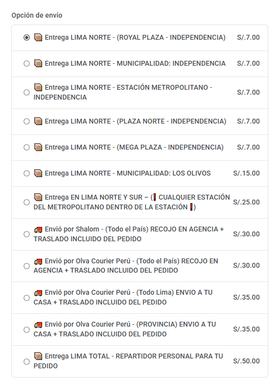Al momento de hacer tu pedido y reunir todos tus productos en el carrito, podrás elegir el tipo de envío que prefieras, ya sea que estés en Lima o en provincia. También podrás seleccionar si deseas recogerlo en agencia o recibirlo directamente en la puerta de tu casa.